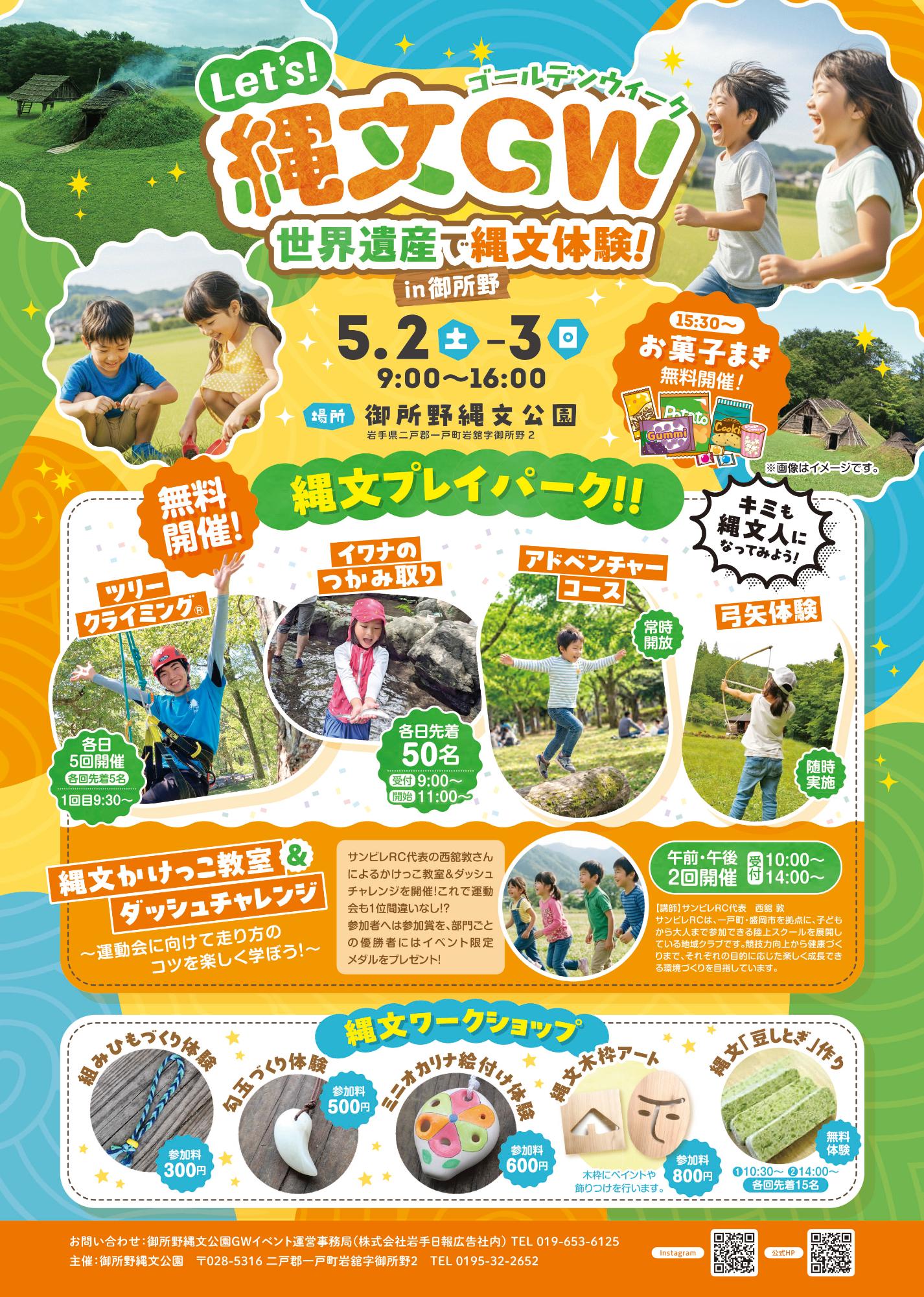 5月2日(土曜日)・3日(日曜日)の2日間、御所野縄文公園にて「Let's! 縄文GW 世界遺産で縄文体験!in御所野」を開催します。