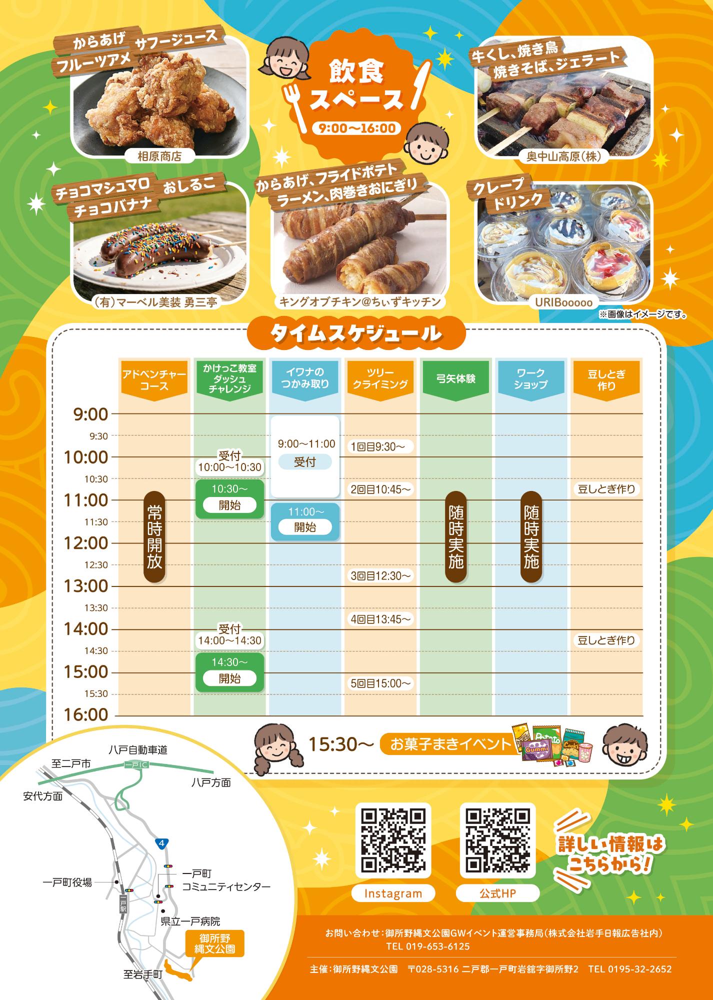 2. 縄文ワークショップ博物館のてづくりプログラムの他に、「縄文木枠アート」や「縄文豆しとぎ作り」も楽しめます。 3. お菓子まき(無料)各日15:30~ 4. 飲食スペース(9:00~16:00)